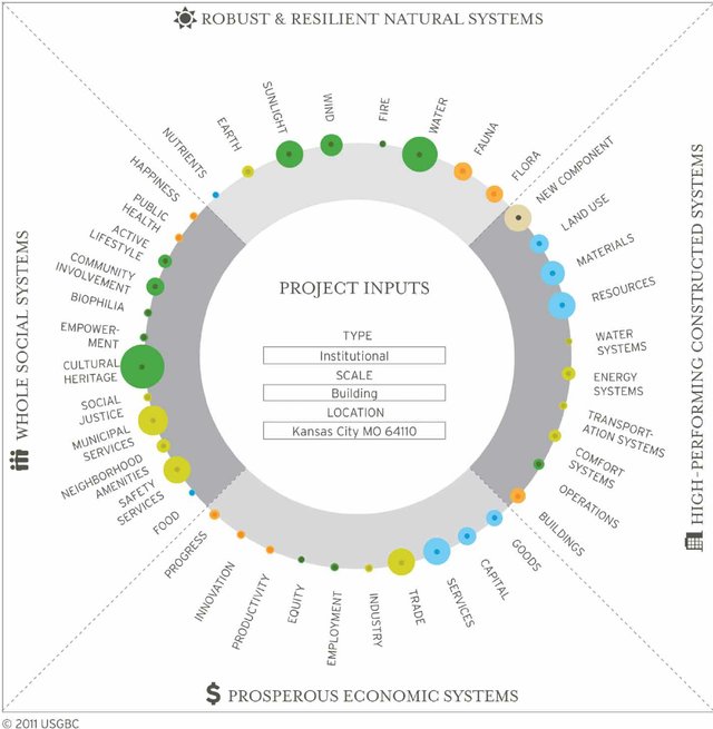 The REGEN Framework was created by the US Green Building Council. This framework uses site-specific visualization (through the scales of colored circles) to help pin point the best points of intervention for a given regenerative project (Hes & du Plessis, 2015). The tool looks at four broad categories: social systems, natural systems, economic systems, and the built environment systems (Svec & Berkebile, 2011). The framework attempts to maximize the benefits and connections in these four systems (Svec & Berkebile, 2011).