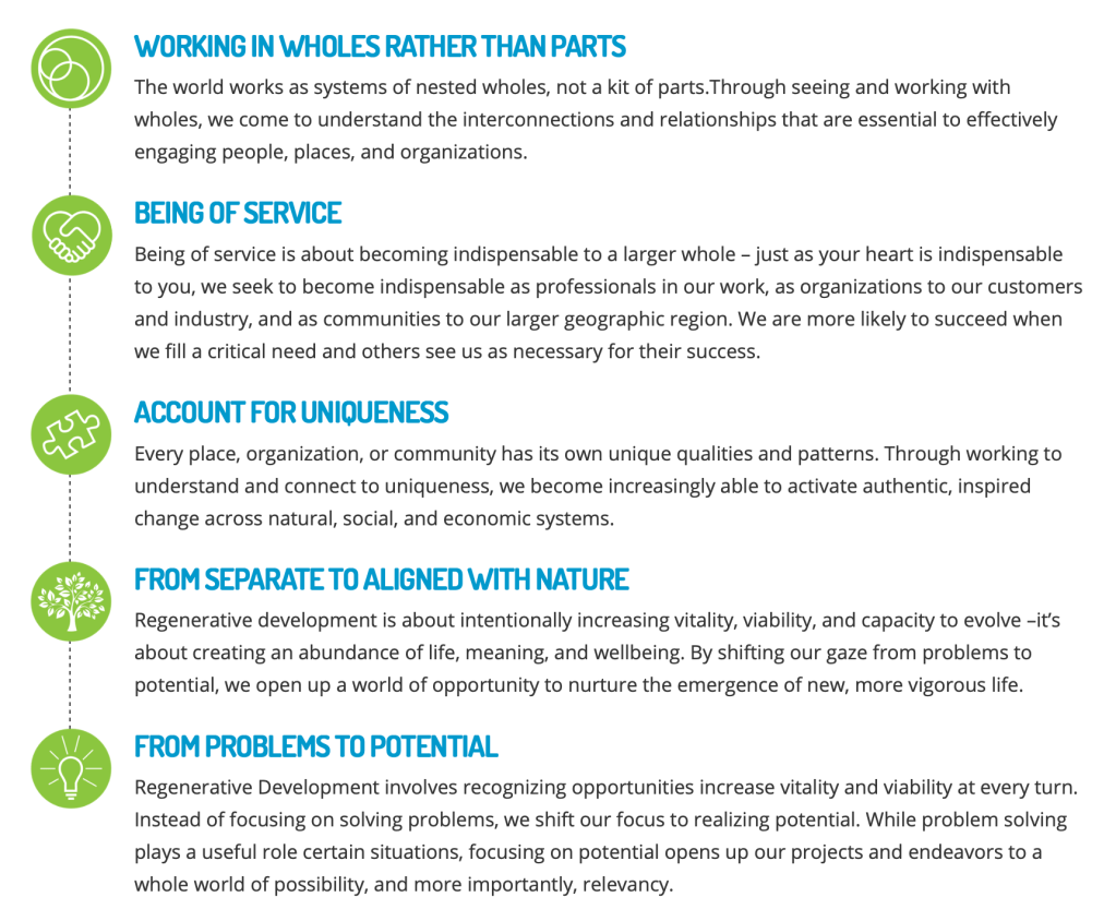 Articles and reports like these remind me of the importance of defining and teaching the essential concepts of regenerative before self-preserving entities fully claim the word as their own. However, Daniel Christian Wahl (well-known regenerative writer and teacher) sees this trend merely as a step in the journey of regenerative practice becoming mainstream. He says, “Building a movement needs ‘band wagons’. As more folks jump on, there is initially a loss in depth of meaning of a framework as people begin to use the language while they are still in the process of developing a better understanding of the deeper significance of associate practice,” (Wahl, 2018). Whether or not these corporate encroachments should be seen as a threat or encouraging, there is a clear need for clarifying the path and practice of regenerative work.