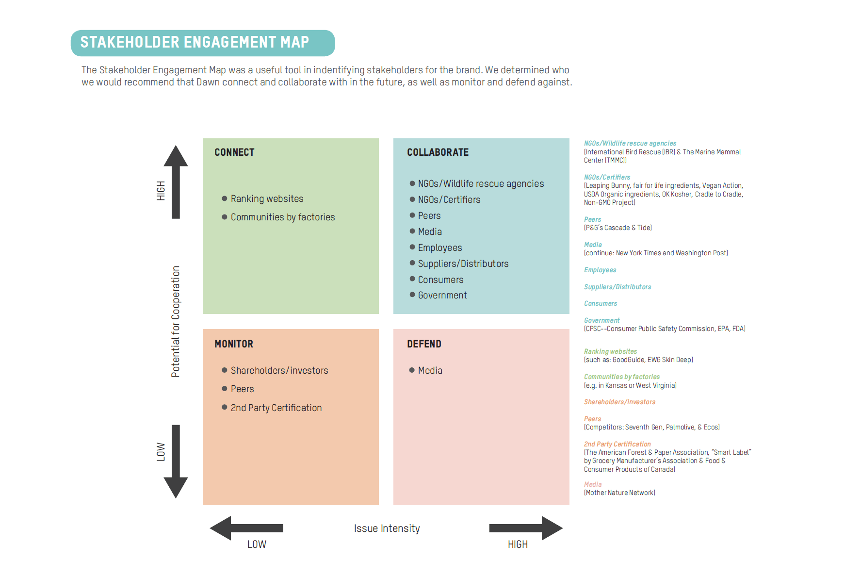 Tools–such as the Sustainability sSWOT analysis and Stakeholder Engagement maps–were used to organize research and hone in on the effective strategies for balancing the triple bottom line: People, Planet, Prosperity.