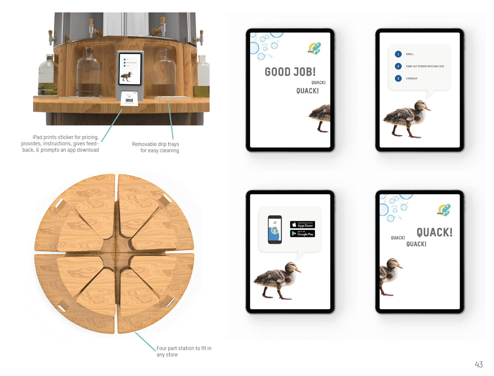 Sunlit was the speculative design project for Dawn*, demonstrating the transformation of a global scale from sustainability curious to sustainability integrated, mitigating for both social and environmental risks. Through a thorough design research and business risk assessment and planning tools, our team prototyped an entirely new product line, Sunlit Dish Soap. Sunlit encompassed and entire product system to transition Dawn away from petroleum based products. Sunlit is completely biodegradable with multiple social and eco-certifications. Sunlit’s rolled out would also include with an innovative retail refill station for liquid soap and a family-friendly app to encourage the purchase of the product, educate about Dawn’s partnership with International Bird Rescue while promoting sustainable behaviors through gamification with adorable animals. (*Dawn® is not affiliated with this content.)
