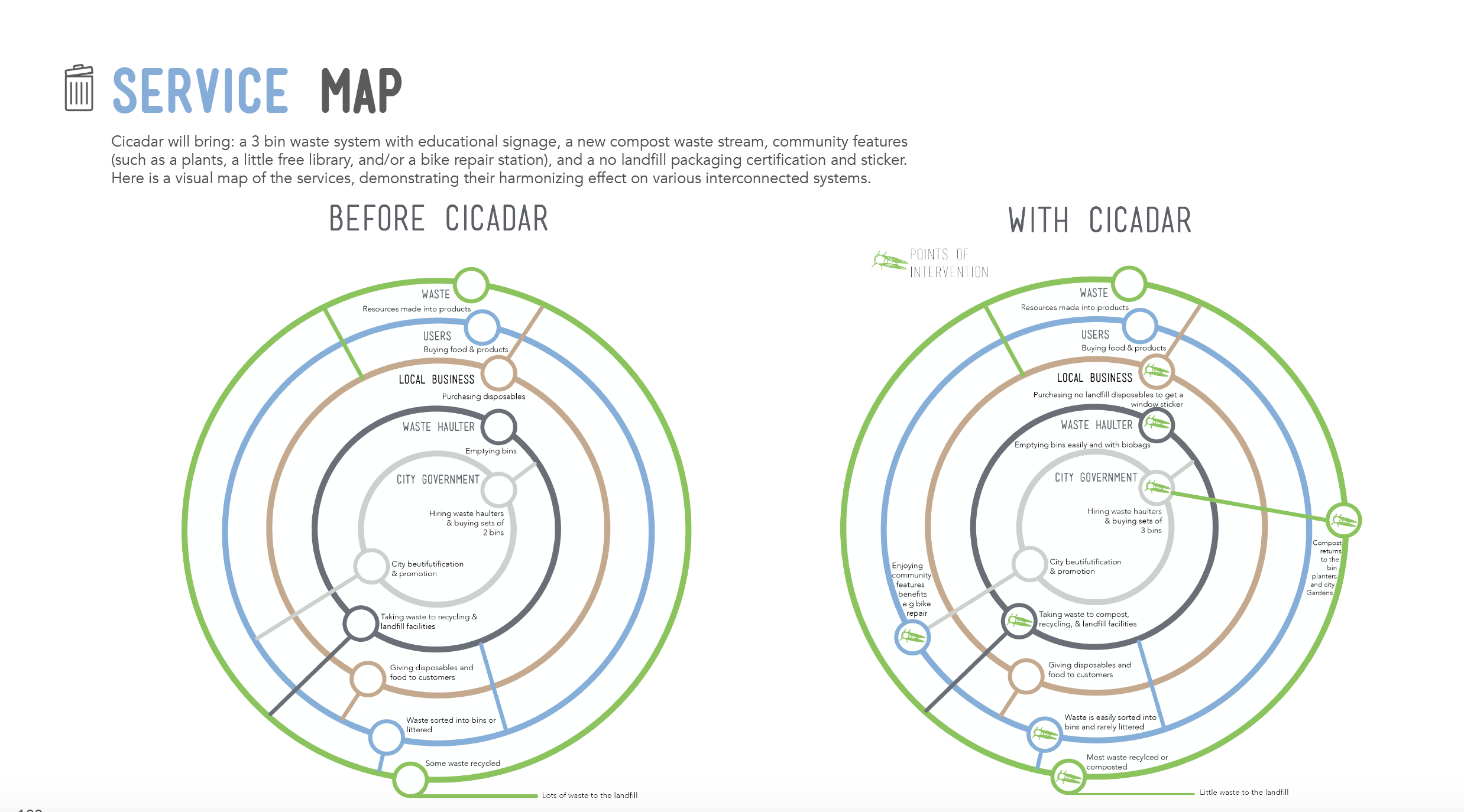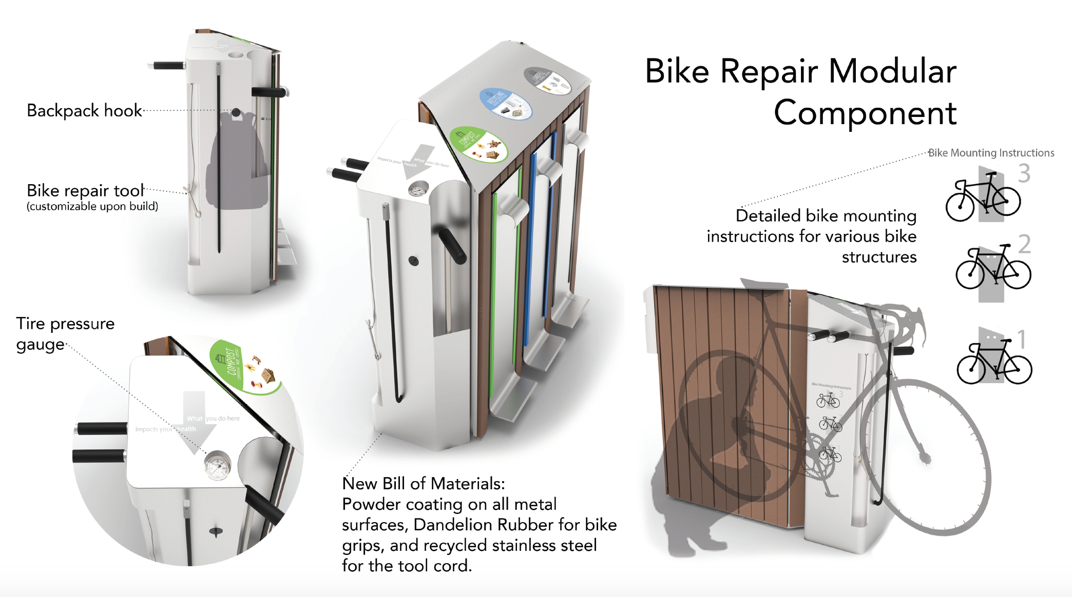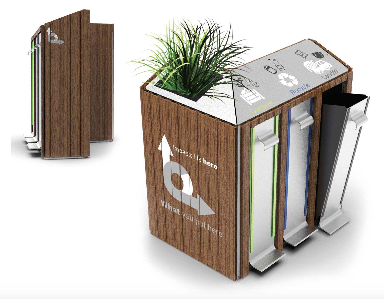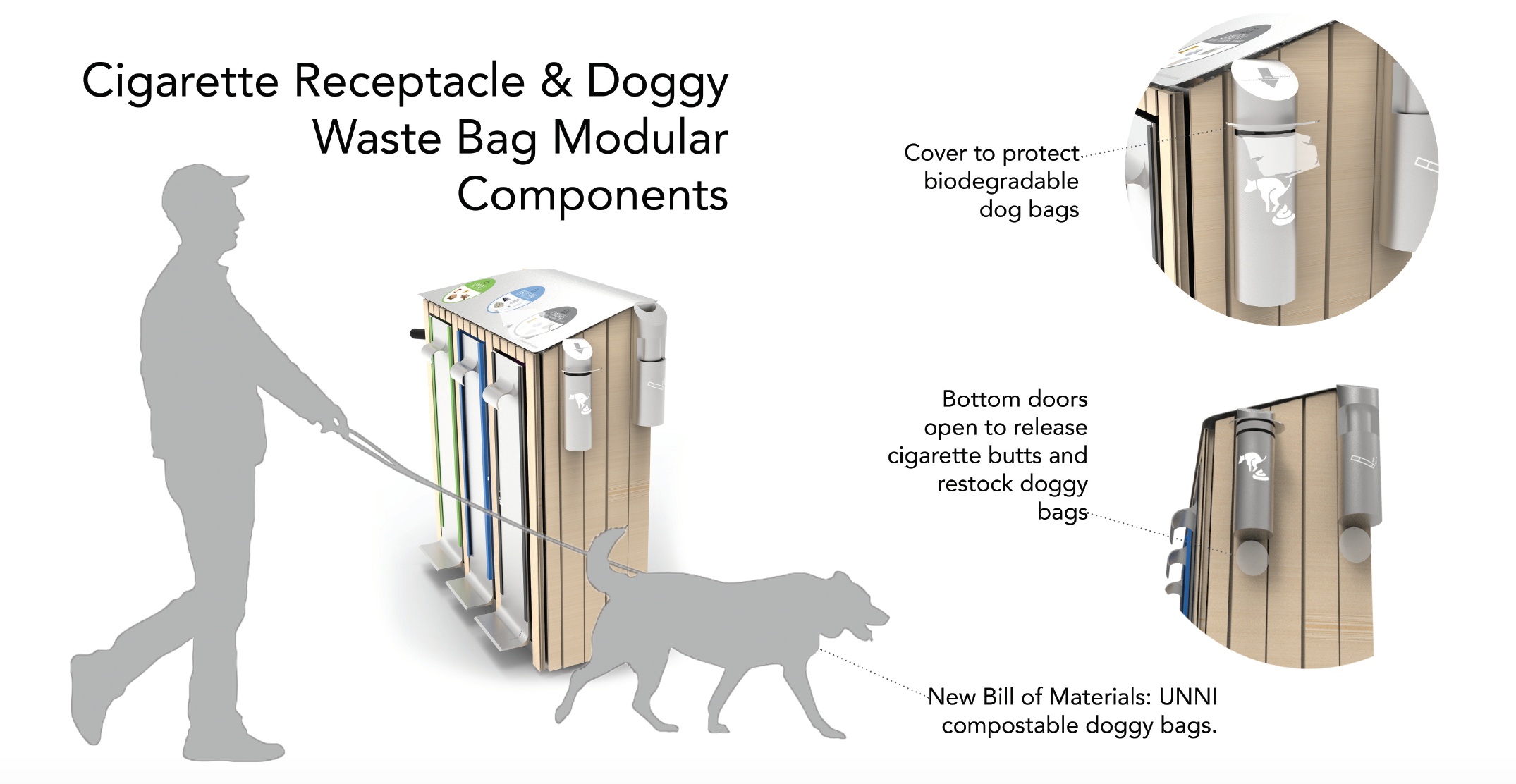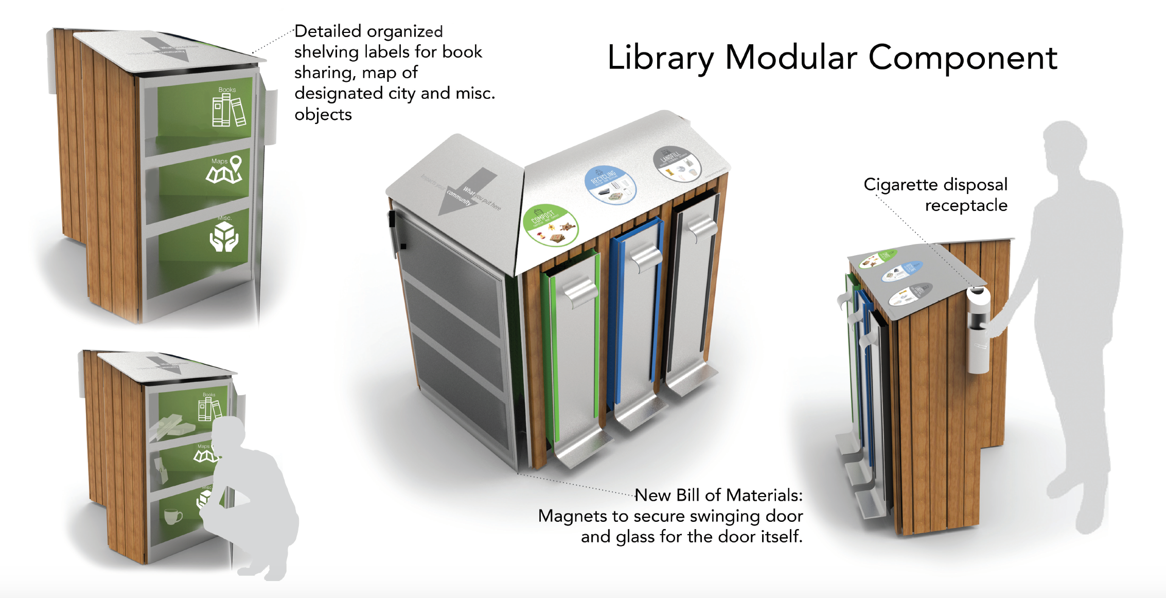My soon-to be teammates latched on to the idea of tackling the overlooked feature of public spaces, and we were off to the design table, with the simple imperative to design a product with ‘sustainable materials’. That product evolved into a system redesign. We found an opportunity to help sort existing waste, provide education, and provide community features. Under our brand: Cicadar©, we designed a 3-bin (compost, recycling, and landfill) modular waste system that has optional added components of: a planter, a bike repair station, a little free library, a cigarette butt catcher, and dog bag dispenser. Additionally, all the bin’s materials were designed to be durable, weather and animal resistant, and disassembled for reuse or recycling.