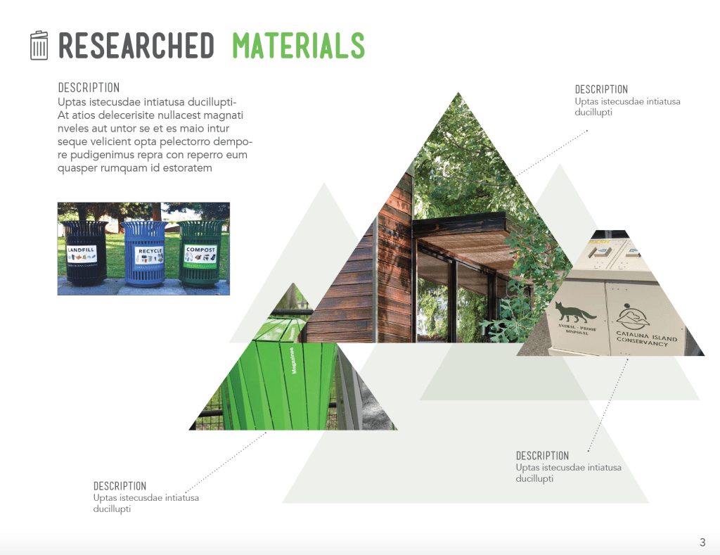 For the Waste Bins Reimagined project, I was head of Graphic Design for our process book and many of the graphics. I started with the basic concept of geometric shapes and the color palette inspired by a modern three bin waste system. The proof of concept is shown below.