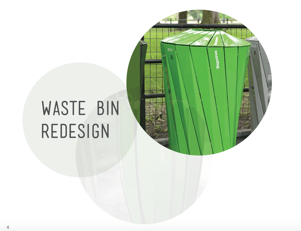 In a sustainable materials course, I proposed we look at redesigning public waste bins. In my work at the Presidio Waste Reduction Department, I came to notice the flaws of the vast majority of public bins. To start, they often are only a landfill bin (plus a non-labeled recycling bin, if you’re lucky). Beyond that, they are exposed to the elements and critters, making them inefficient at doing their primary job: holding waste. Finally, bins are something people try to avoid contact with because they are often confusing eye-sores. Yet we need to interact with them.